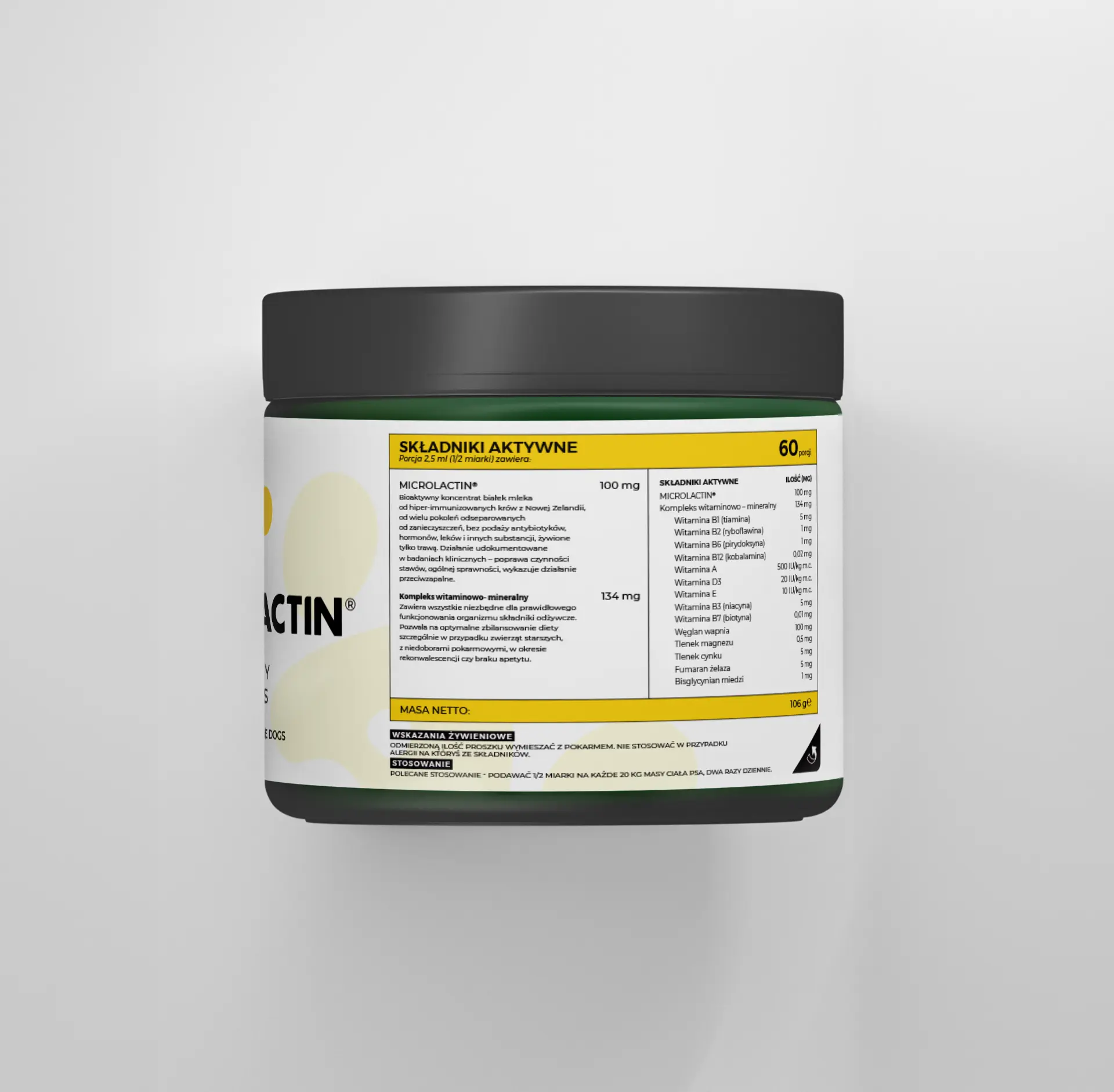 Specjalistyczny suplement diety w formie proszku dla dużych psów. Jako jedyny łączy szeroki kompleks witaminowo-mineralny z przebadanym MicroLactin® – naturalnym koncentratem białek mleka o działaniu przeciwzapalnym. Wspiera odporność, witalność, regenerację oraz codzienną kondycję psów w każdym wieku – szczególnie wtedy, gdy sama karma to za mało.